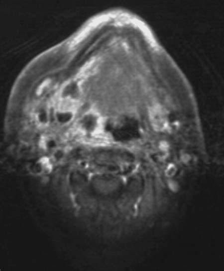 In der T1-gewichteten Sequenz mit Kontrastmittel im Bereich der Mundhöhle kommt die rechte Tonsillenregion deutlich vergrößert mit Signalsteigerung zur Darstellung. Innerhalb der Raumforderung befinden sich signalarme Bereiche im Sinne von Nekrosen.