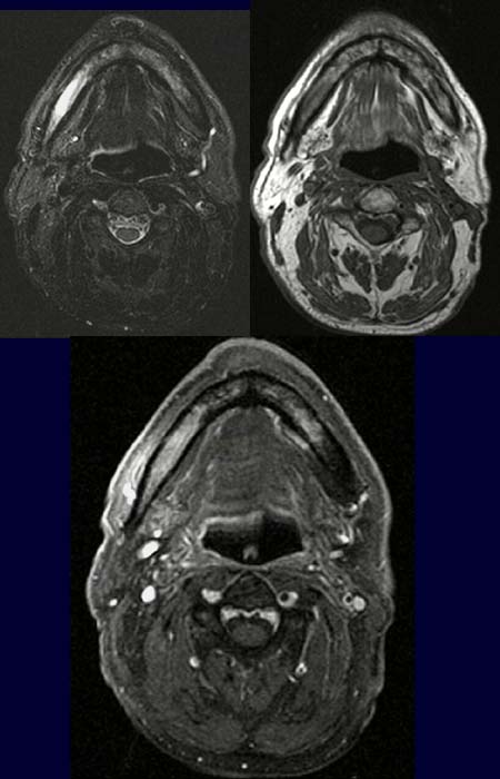 In der T1-Wichtung nach Kontrastmittelgabe mit Fettsättigung (Bild unten)kommt dieses Areal wieder deutlich signalreich zur Darstellung.
