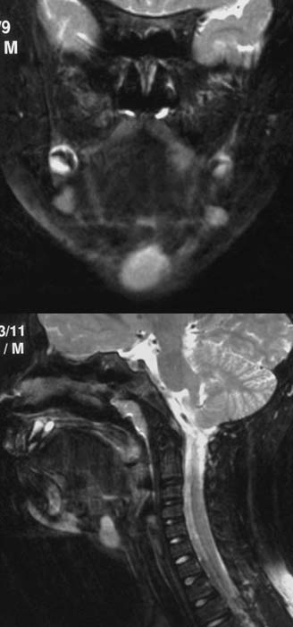 Im sagittalen Schnitt in T2-Wichtung etwa in der Medianebene (rechtes Bild)