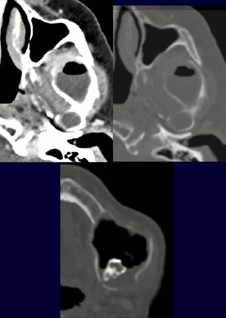 Im CT des Gesichtschädels kommt im Weichteilfenster nach Kontrastmittelgabe (linkes Bild oben) auf Höhe des Kieferwinkels eine Raumforderung zur Darstellung, teilweise mit und Flüssigkeit, teilweise mit Luft gefüllt. Zusätzlich kommt ventral eine Weichteilkomponente zur Darstellung.