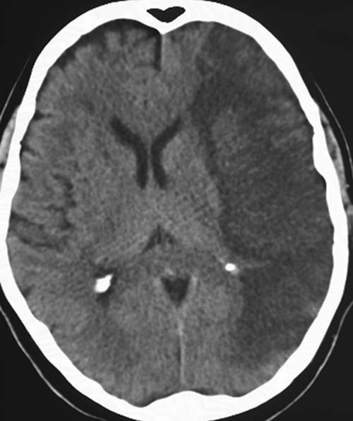 raumfordernd wirkender Mediainfarkt links (48-96h). Da die Stammganglien