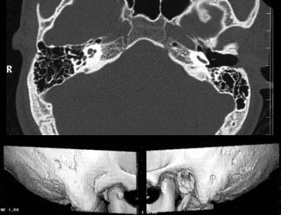 Klinisch auf der rechten Seite kein Gehörgang erkennbar und Dysplasie
